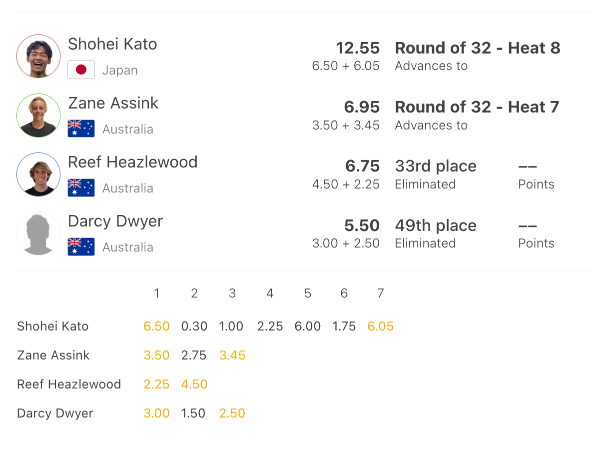 男子ラウンドオブ32では、H3で小林桂と新井洋人が同じヒート。H5に伊東李安琉がクレジット。H8で加藤翔平と大音凛太がリアム・オブライエンとウインター・ヴィンセントと対戦する。