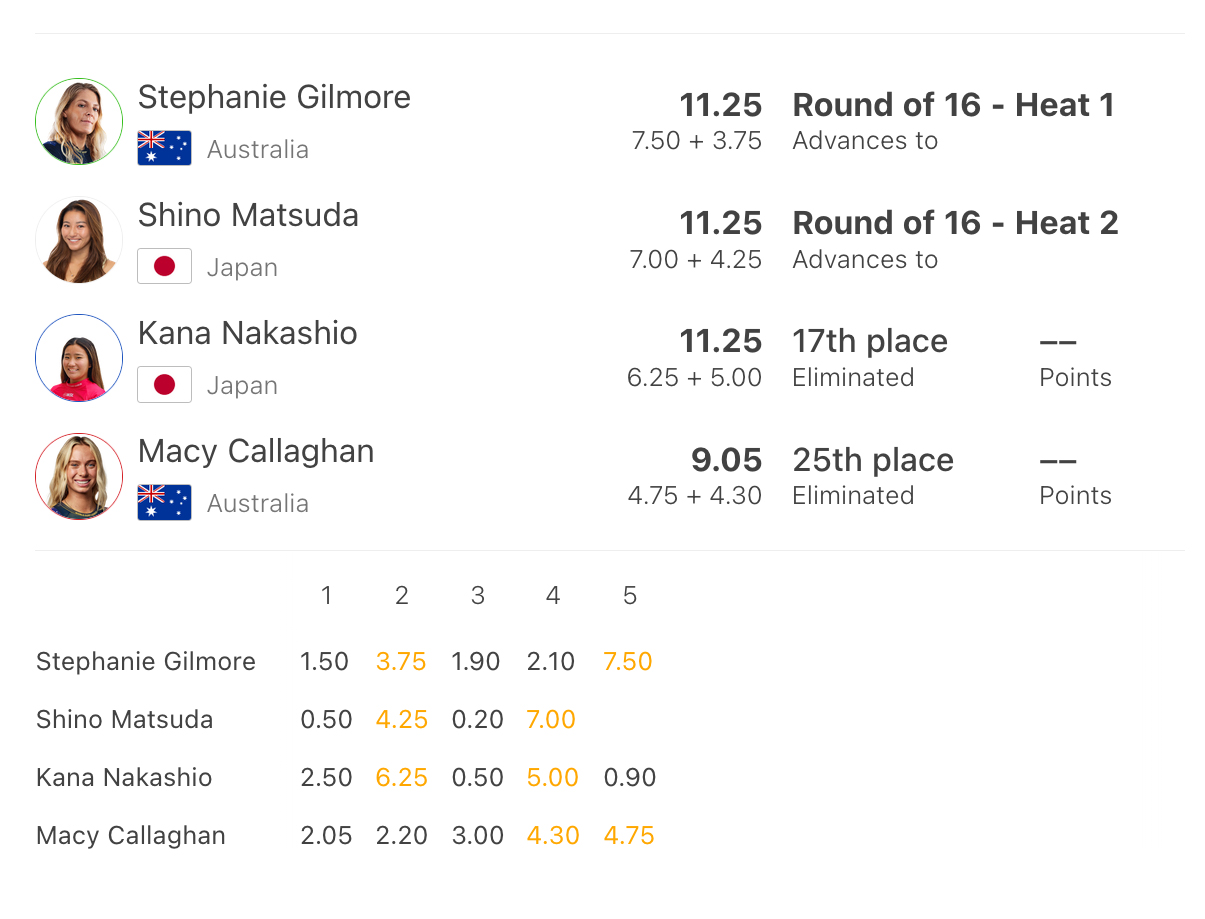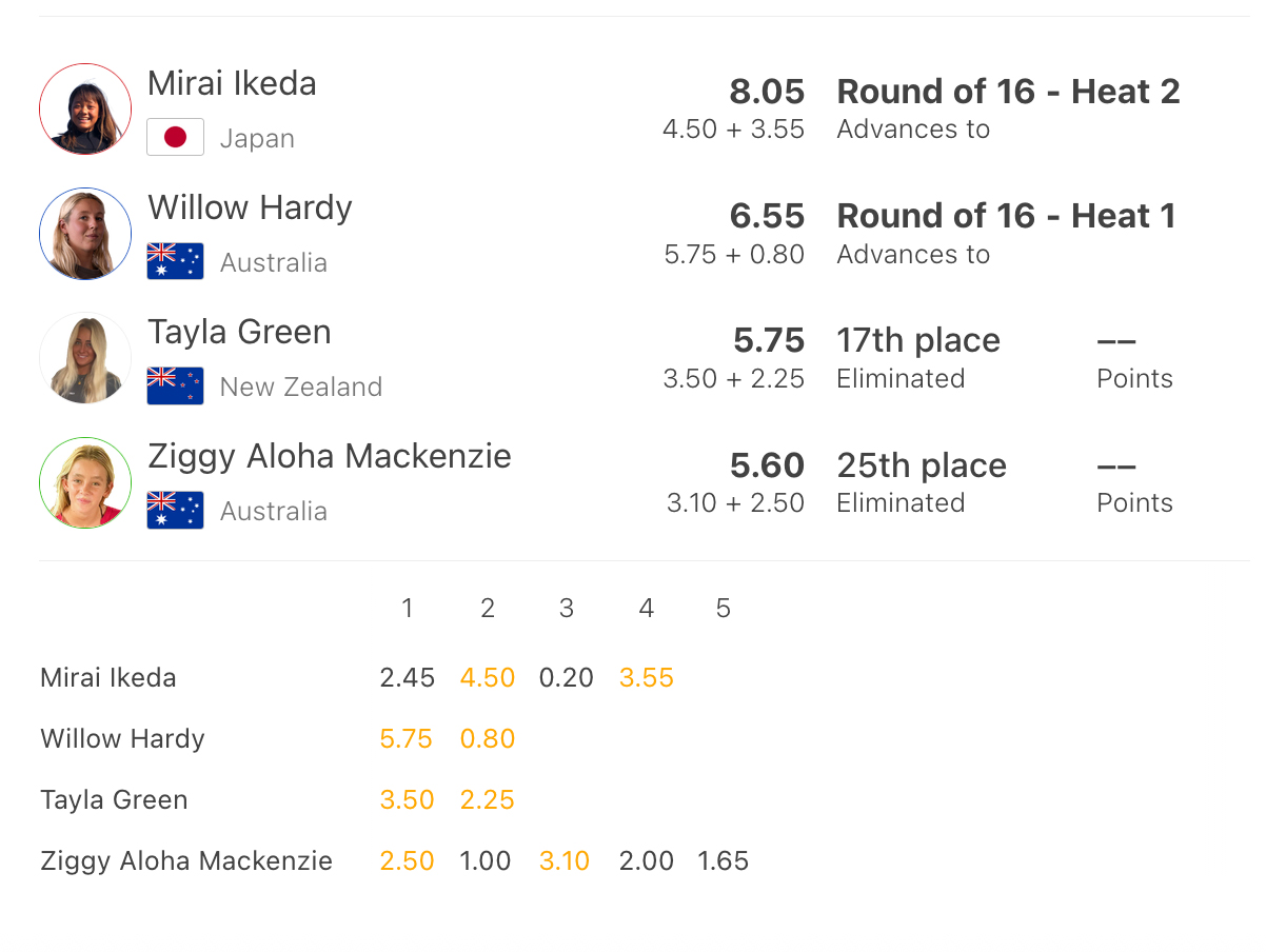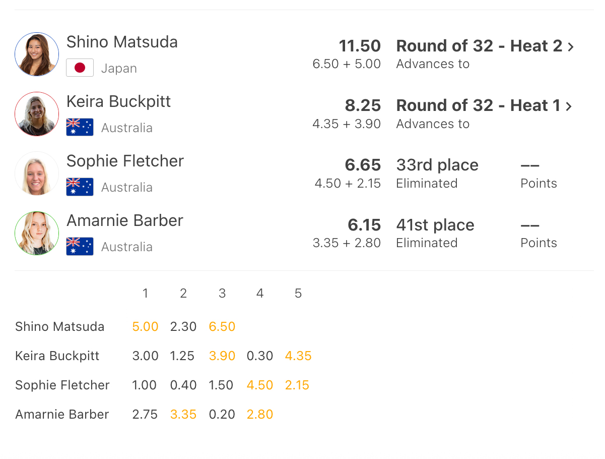 3名が激しいデッドヒートを演じた。ヒート前半リードを取った中塩だったが、最後にステフと松田がハイスコアをマーク。3名がまさかの11.25で同点となり、カウントバックでトップスコア7.50を持っていたステフが1位、7.00の松田が2位、中塩佳那は惜しくも3位で敗退となった。