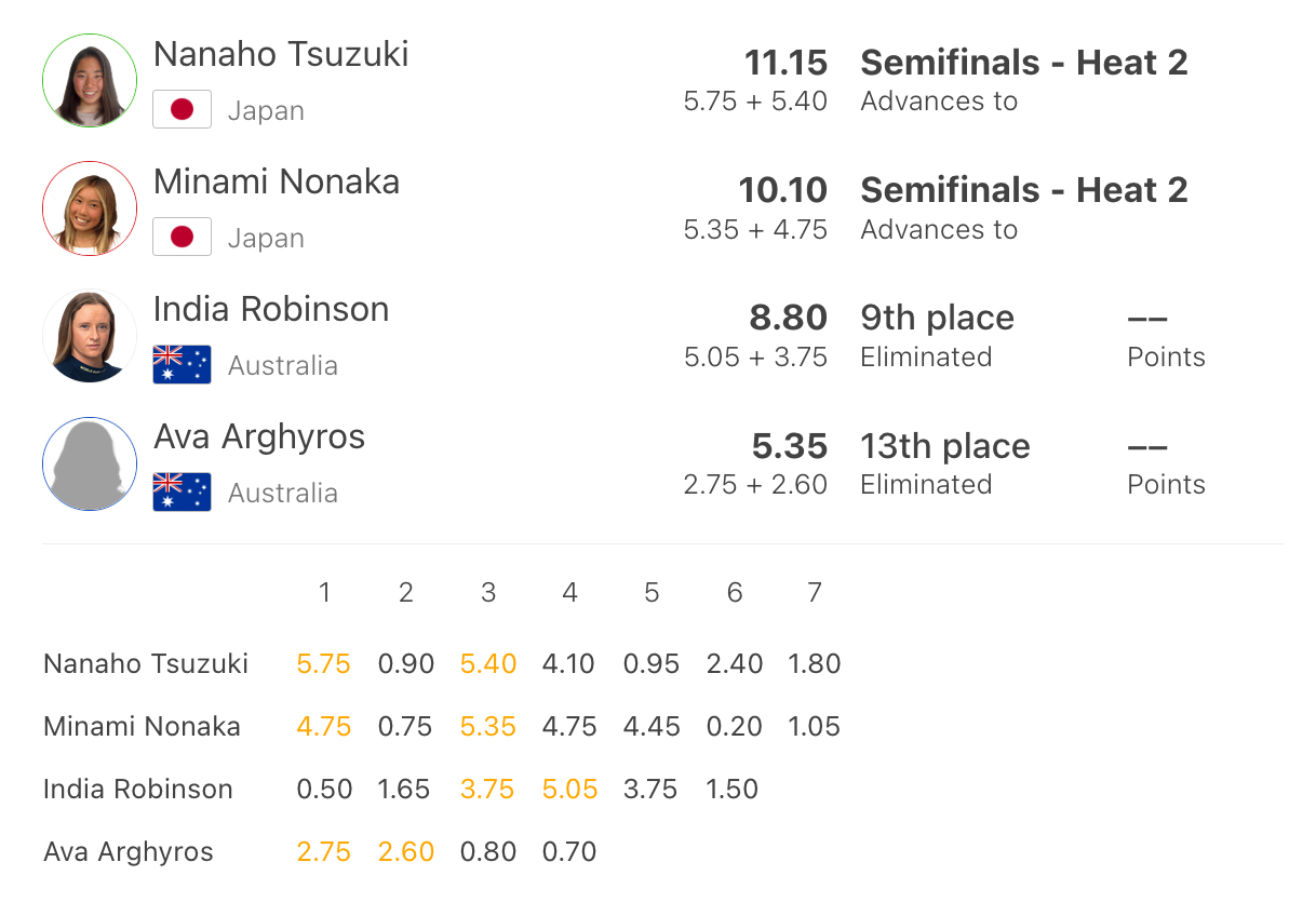 好調な野中はさらにスコアを上げて5.35をスコアしてトップに。都筑は後半にパワーターンのコンビネーションで5.40をスコアしてトップに。インディア・ロビンソンが後半追い上げるが、好調な二人、都築虹帆と野中美波がワンツーで勝ち上がった。