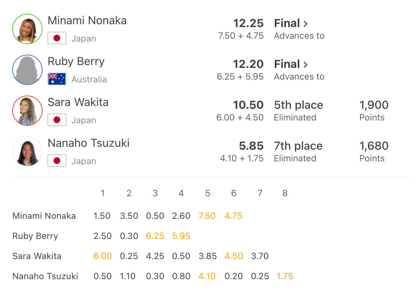 ハパッツはより忍耐強く攻め、力強い2ターン連続技で7.50を獲得。残り13分で5.85を追加し、ブラウンをわずか0.35ポイント差でリード。この差はブザーが鳴るまでホールドされた。3位と4位はルビー・ベリー(AUS)と野中美波(日本)がそれぞれ獲得。両選手とも好調な結果を継続している。