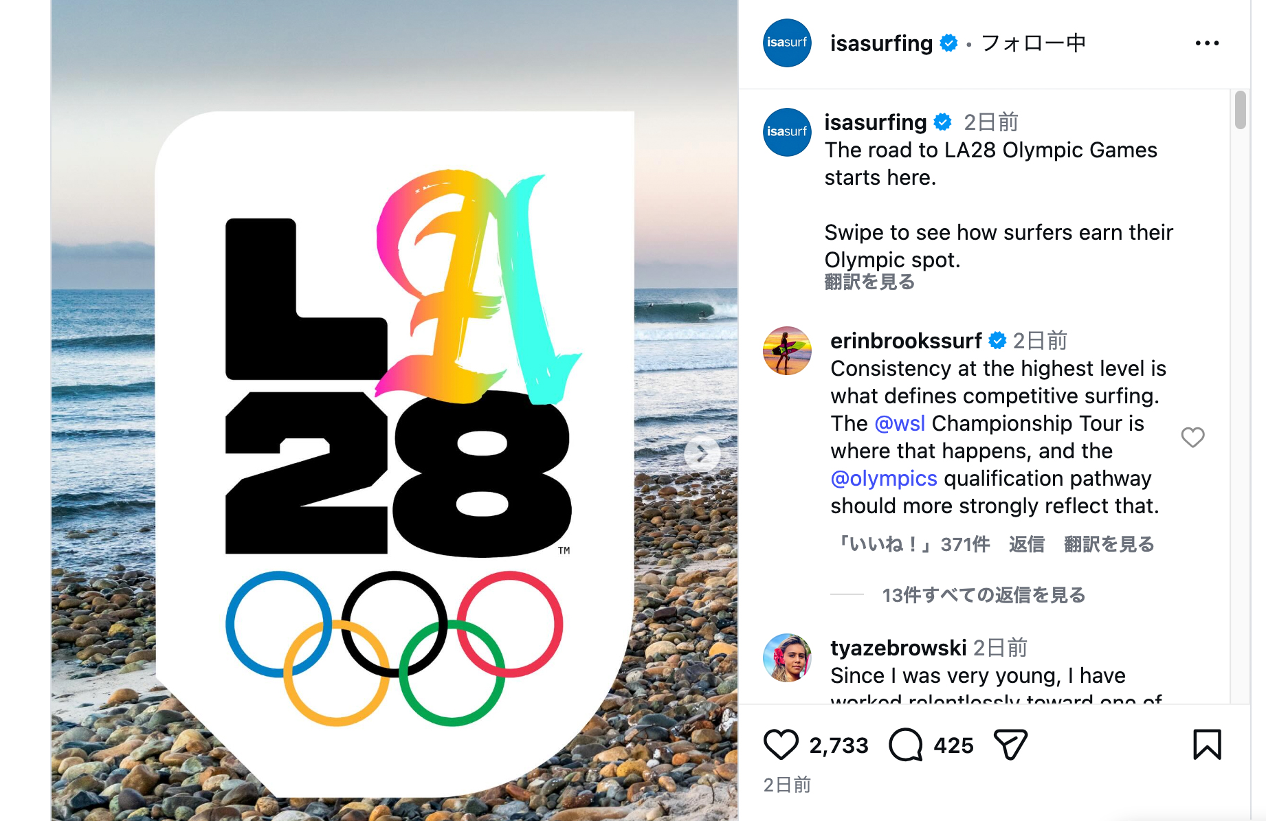「WSLと我々の選手たちは、東京五輪やパリ五輪と同様に、トップランクのサーファーが五輪出場権を得られるよう、予選プロセスの修正を求めている。この問題を解決し、スポーツにとって最善の形で前進することを望む」とクロスビーは締めくくった。