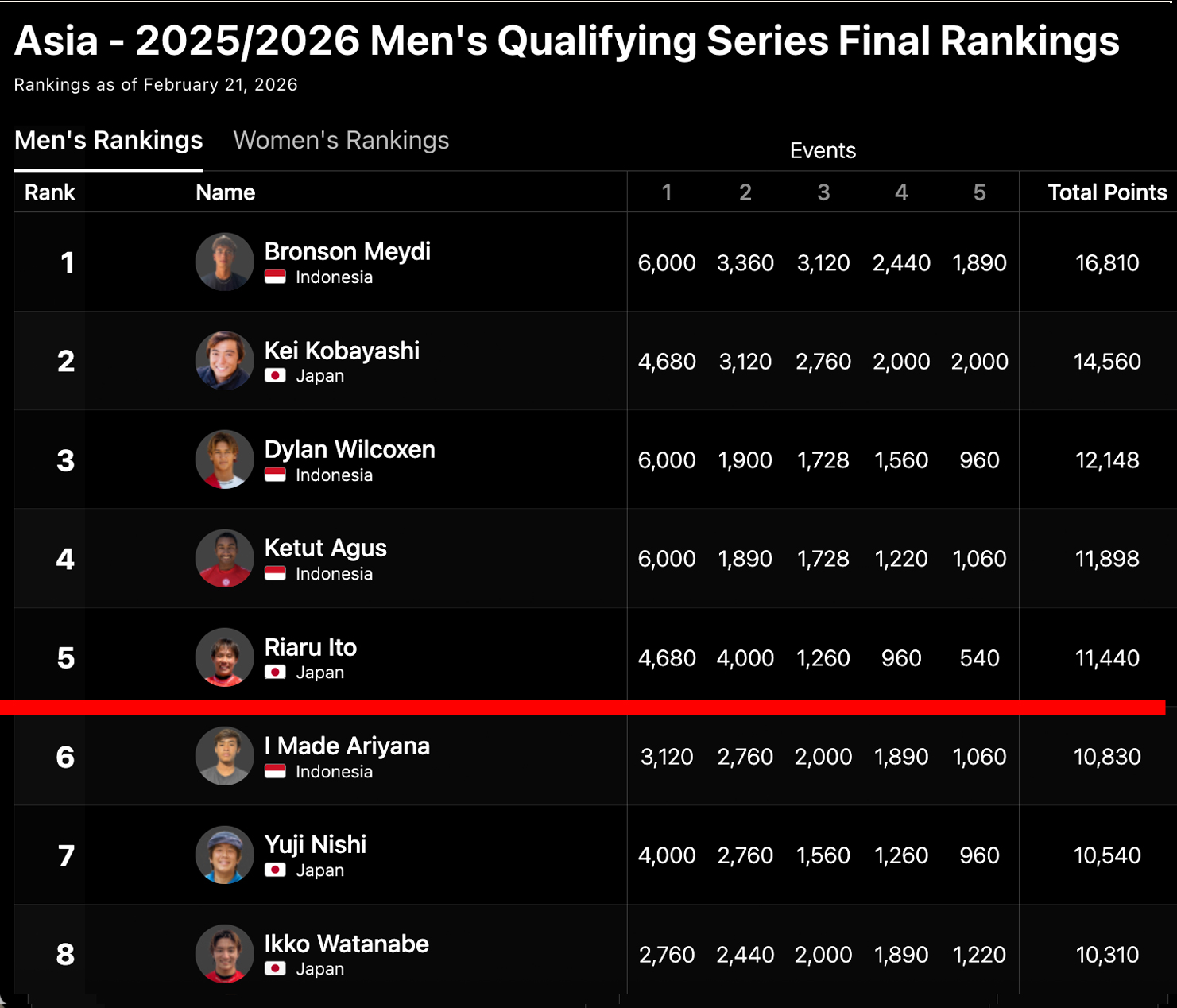 現在、男子アジアQSランキングは、ブロンソン・メイディがこれまでトップを維持していた小林桂を逆転してトップに。小林桂は2位となり、ディラン・ウィルコクセン3位、ケトゥ・アグス4位、伊東李安琉が5位に付けて、6位にマデ・アリヤナ、7位に西優司が最終戦で勝負に出る。