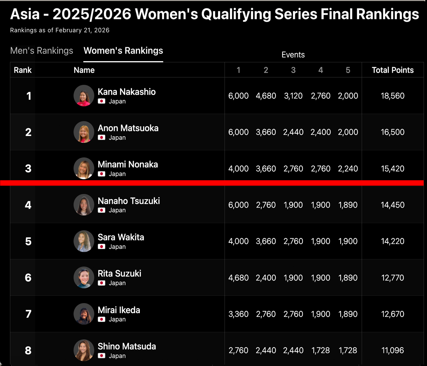 女子アジアQSランキングは依然として中塩佳那が2000ポイント以上の差を付けてトップを独走し最終戦は欠場。2位に松岡亜音、3位にバーレーでファイナルに残った野中美波がトップ3を維持。都築虹帆が4位につけ、脇田紗良が5位、鈴木が6位、池田が7位で最終戦に挑む。がんばれ!日本!