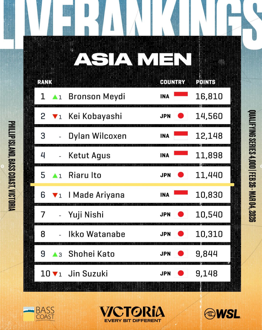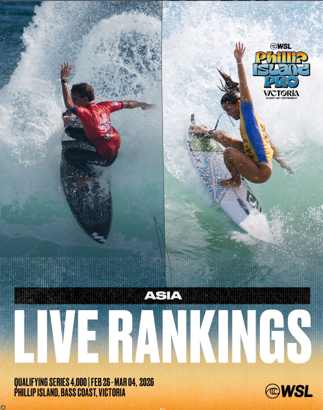オーストラリア、ビクトリア州、フィリップ・アイランド、ケープ・ウーラマイ(2026年2月26日木曜日) – ワールド・サーフ・リーグ(WSL)フィリップ・アイランドプロ・クオリファイング・シリーズ(QS)4000 およびジュニア・クオリファイング・シリーズ(JQS)の初日は、クリーンで波の高いコンディションが選手たちを迎えた。