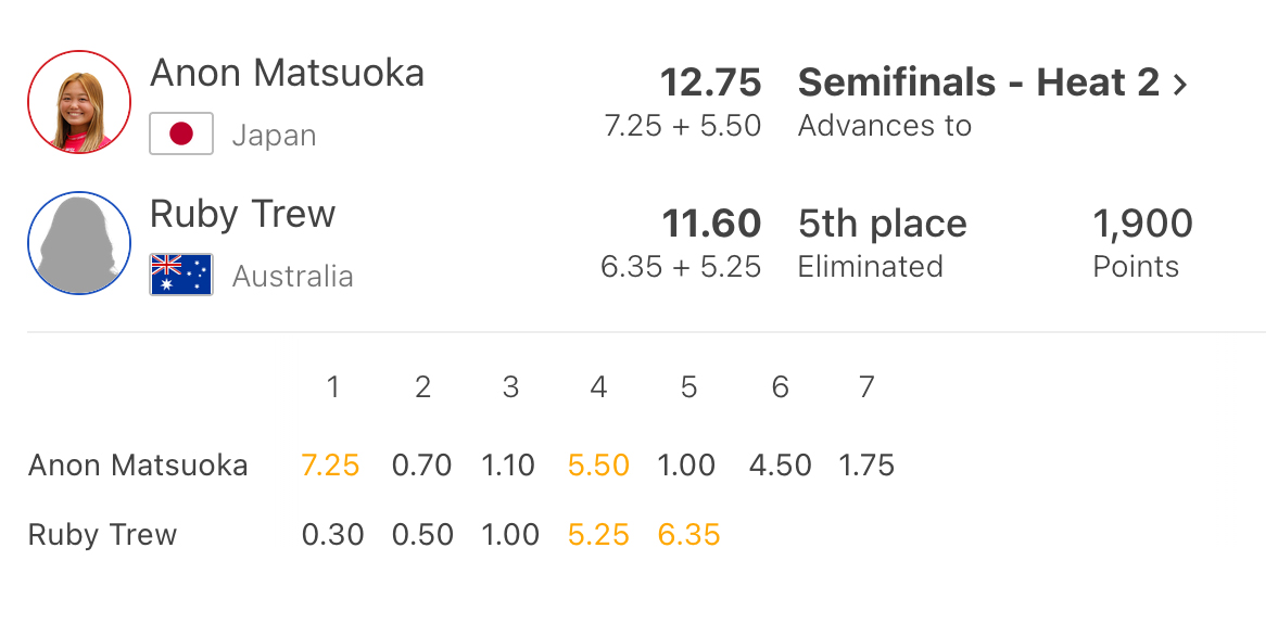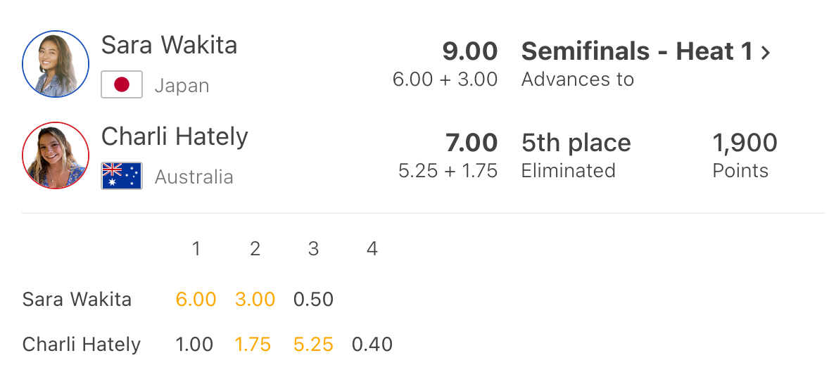 セミファイナルヒート1でルーシー・ダラーと対戦した脇田紗良。ルーシーがバックハンドで5.25をスコアしてヒートを開始。バックアップを2.75としてルーシーがヒートをコントロールする。