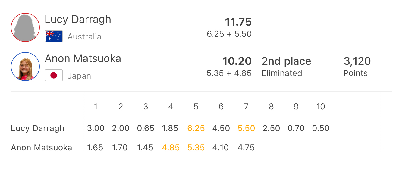 ファイナルではルーシー・ダラーと対戦した松岡亜音。両者とも決定的なスコアがないまま後半へ。スマートな試合運びを見せるルーシーがバックハンドでクリティカルなターンを決め、6.25をスコアしてリードを取る。