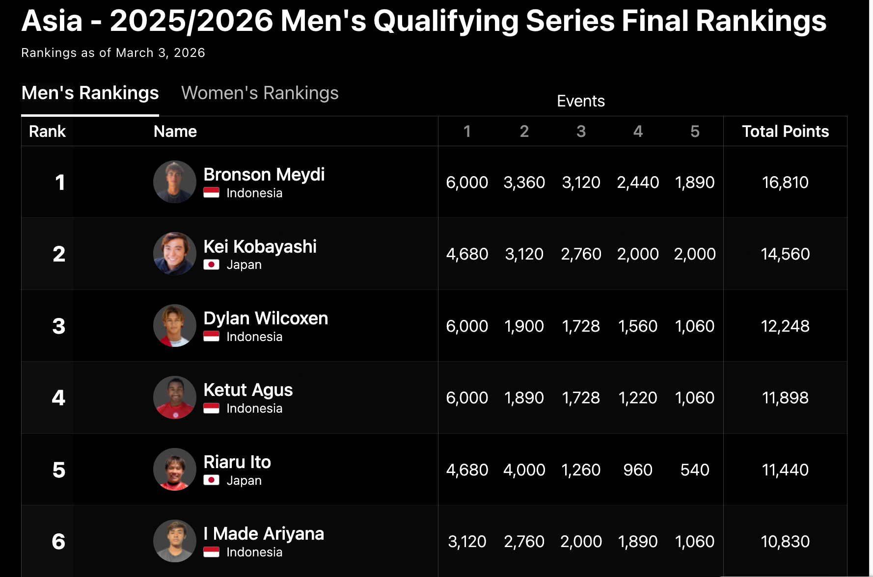 男子では1位がブロンソン・メイディ(INA)、2位小林桂(JPN)、3位ディラン・ウィルコクセン(INA)、4位ケトゥ・アグス(INA)、5位伊東李安琉(JPN)が来季のCS出場権を得た。男子もワイルドカード1名が後日発表になる予定。