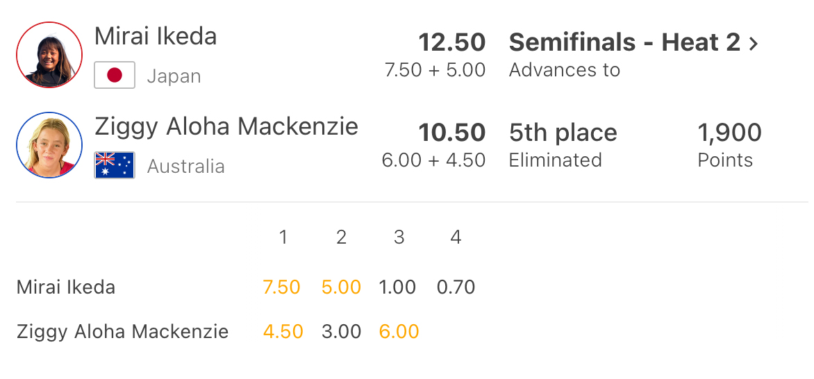 ルーシーはバックアップを4.50としてリードを広げていくが、松岡亜音は思うような波が掴めない。ヒート終盤にバックアップを5.50と広げるルーシー。松岡も4.85をスコアして追い上げる。