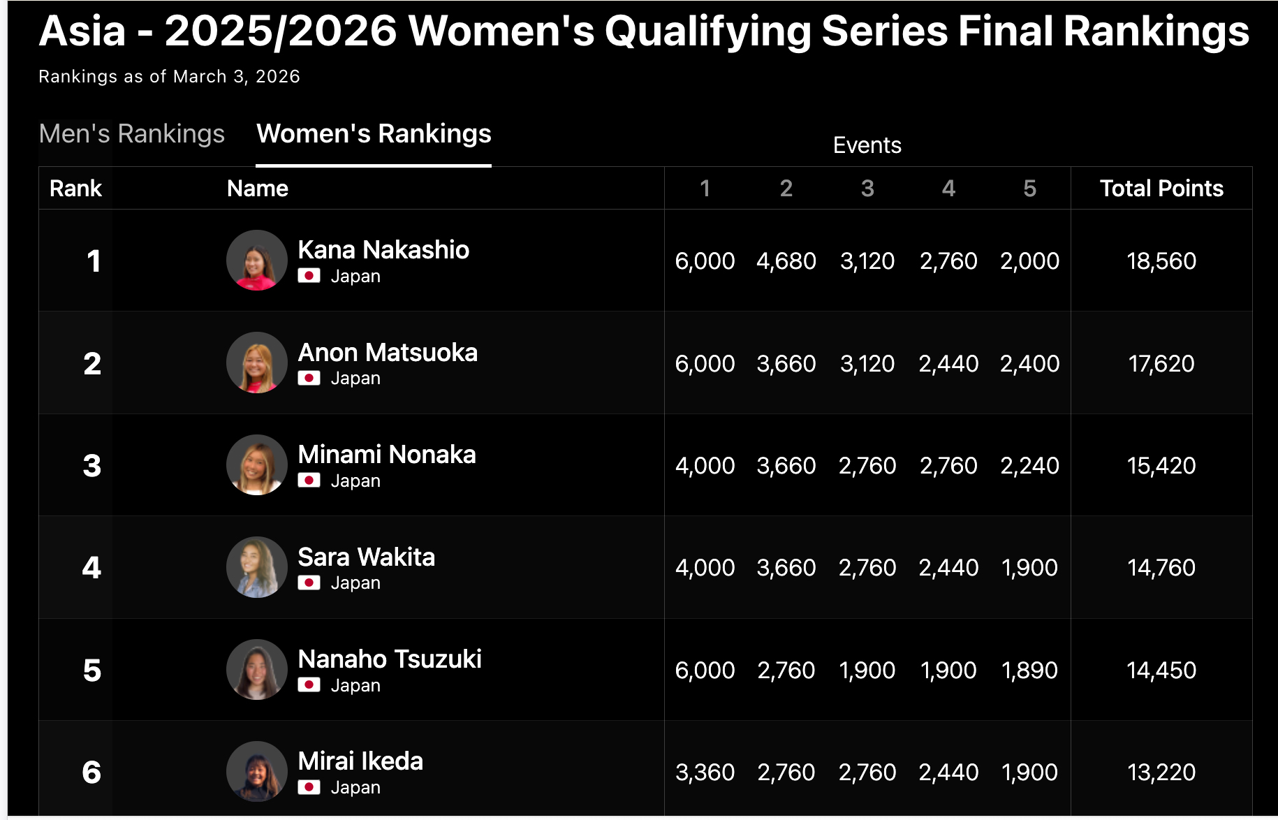 これでアジアQS女子ランキングが確定。1位は中塩佳那、2位松岡亜音、3位野中美波が来シーズンのチャレンジャー・シリーズ出場が決定。ワイルドカード1名は後日発表になる。
